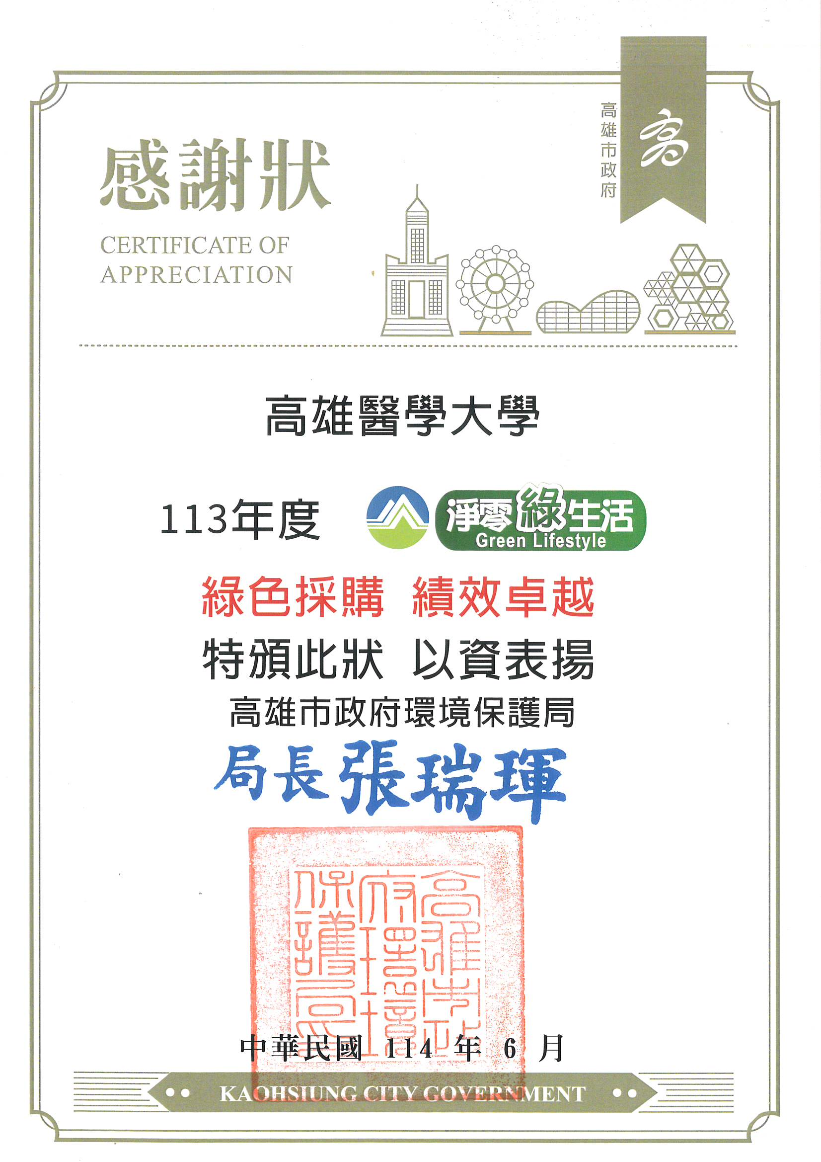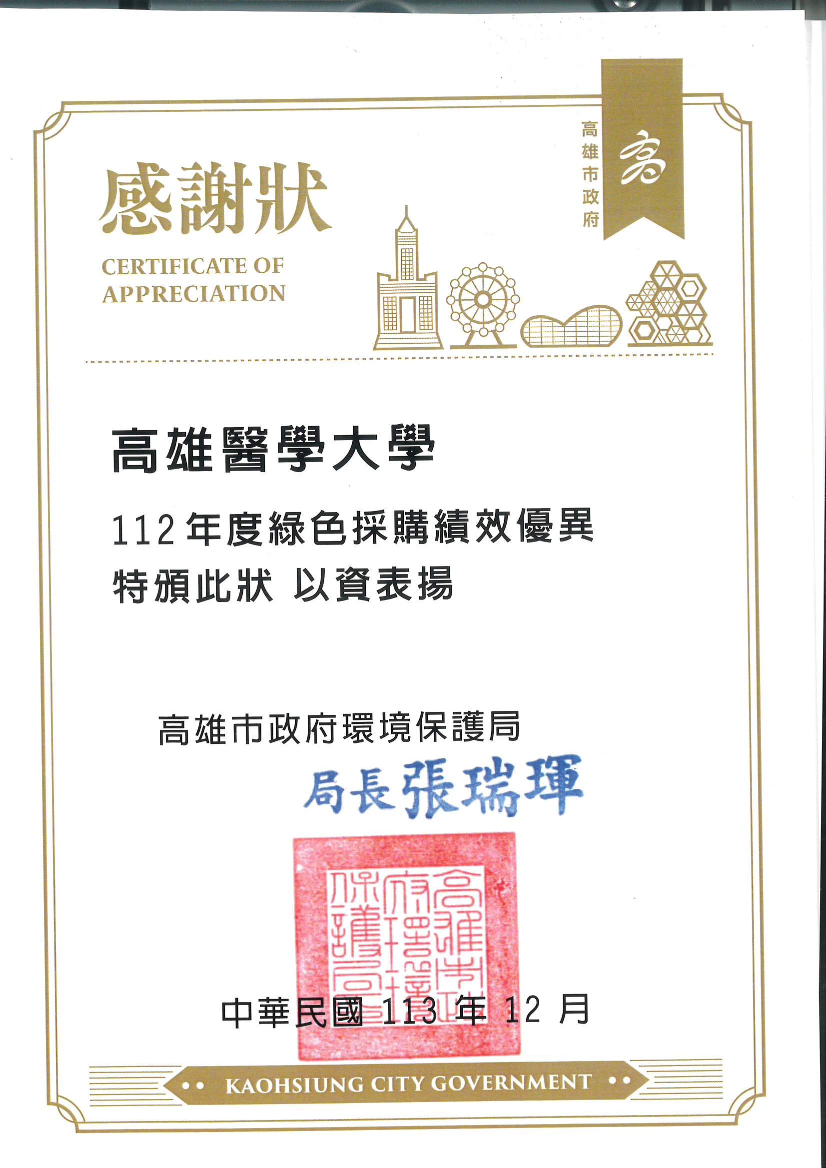 111年度綠色採購表揚獎狀 112年度綠色採購表揚獎狀 113年度綠色採購表揚獎狀